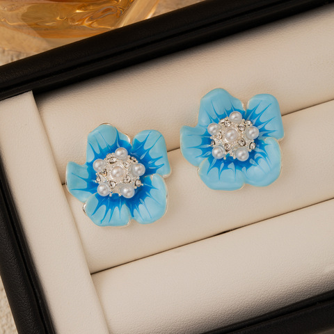 Pendientes de tuerca de perla de aleación sin deslustre de flor azul para mujer
